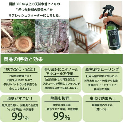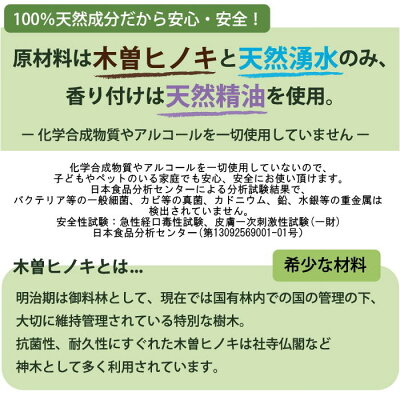 ■アルコールゼロ!  天然精油とヒノキ蒸留水のみ! 独自製法により精油を混合    ■本来の香りを楽しめる!  アルコールで希釈していないので、精油本来のフレグランスを楽しめます  ■アロマのリラックス効果!  加湿器やお風呂に入れたり、マスクにシュッとかけて香りを楽しめます  ベースがヒノキなので豊富なフィトンチッド(主成分のガジノール・αピネン)  森林浴を満喫  ■消臭がすごい!  靴や足の臭い、加齢臭の主成分「イソ吉草酸」の消臭率はなんと99%以上  ベッドカバーやファブリック、リビングや車内、玄関の靴箱の嫌なにおい対策に  ■除菌がバツグン!  食中毒の原因菌の除菌率も99%以上  天然成分100%なのでキッチンの除菌にもオススメ  ■虫よけ効果!  観葉植物の虫よけや潤いにも!アウトドアの虫除け対策としてもオススメ  商品説明が書かれたオリジナルタグ付き。
